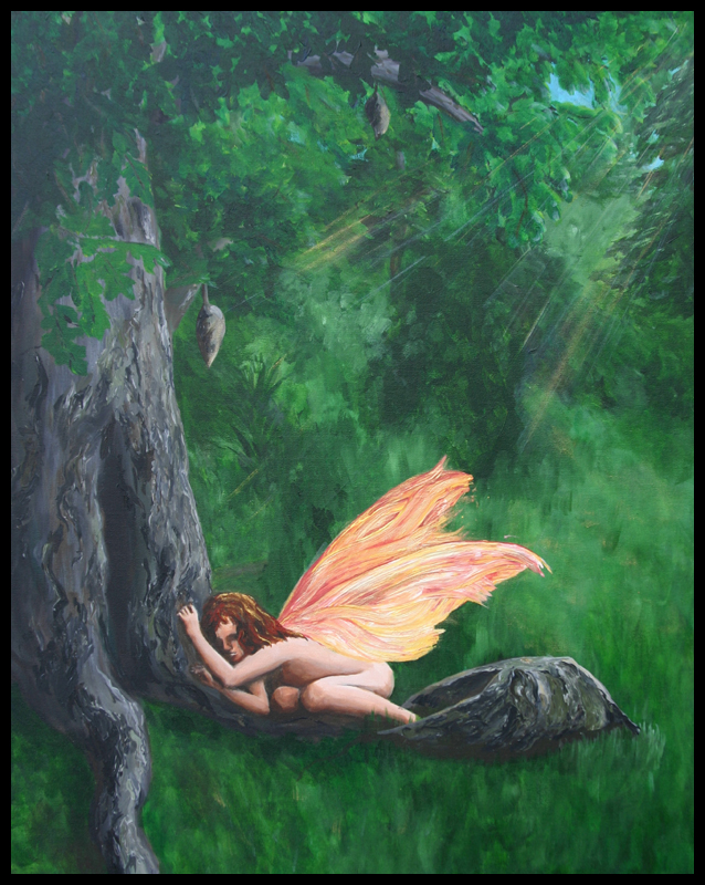 This painting, originally inspired by a friend's 7-year-old daughter who liked to pretend she was a fairy, sat unfinished, stuck, for over a year, long enough that I thought I might never finish it. This spring, however, she spoke to me once more. | ||||